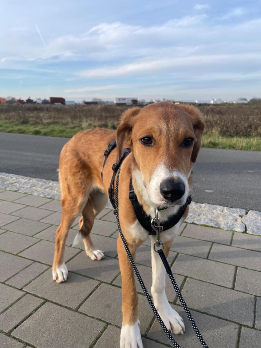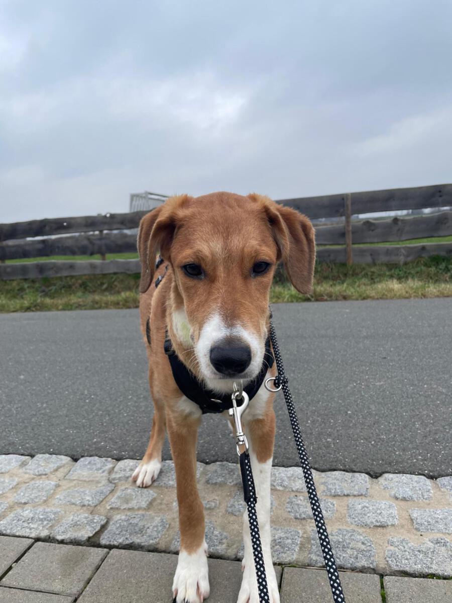 Arkani läuft sehr gut an der Leine, ist orientiert und reagiert auf seinen Namen. Straßenverkehr außerhalb der Innenstadt ist kein Problem für ihn, andere Hunde interessieren ihn kaum. Menschen, Fahrräder oder Bewegungen von hinten findet er noch gruselig, lässt sich aber trotzdem gut durch solche Situationen anleiten und führen. Jagdbedingtes Interesse an Vögeln ist vorhanden, er bleibt dabei jedoch gut ansprechbar.