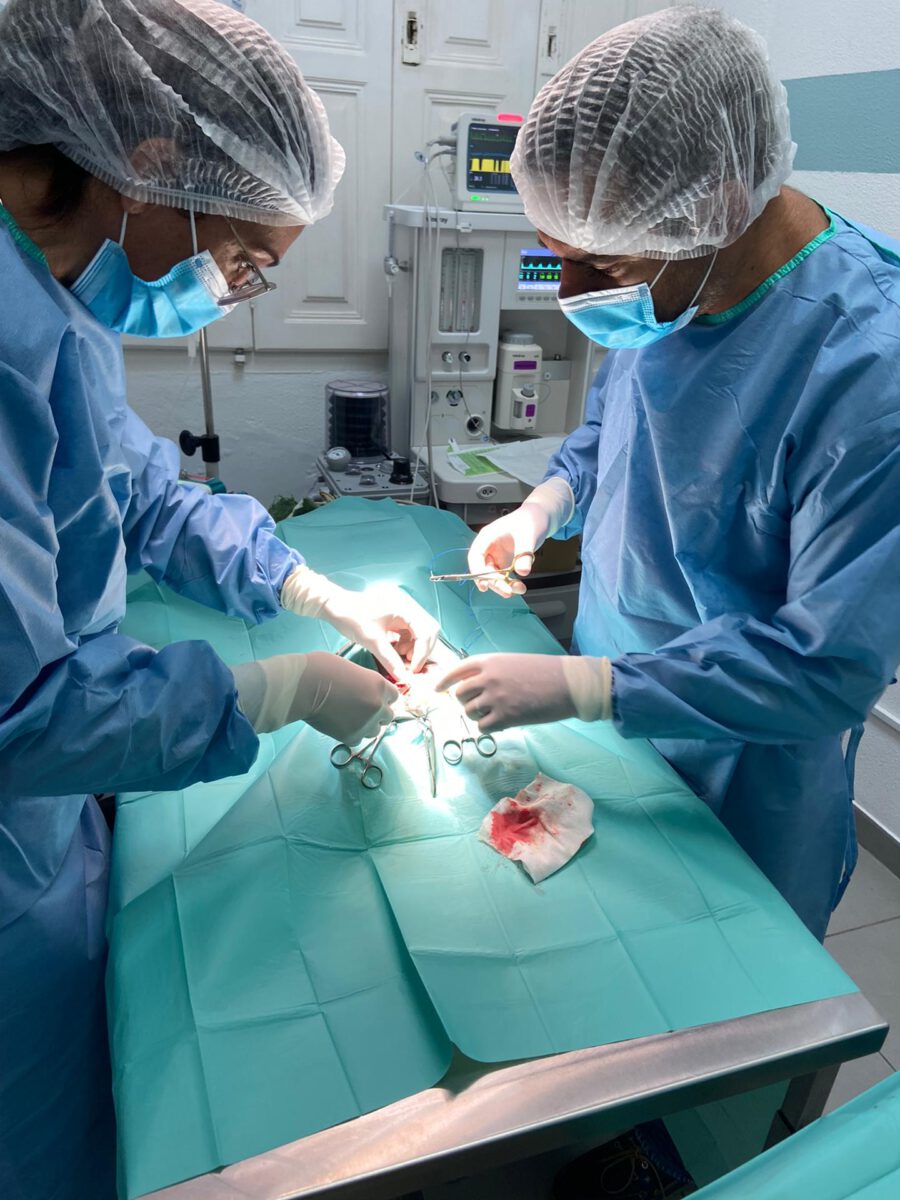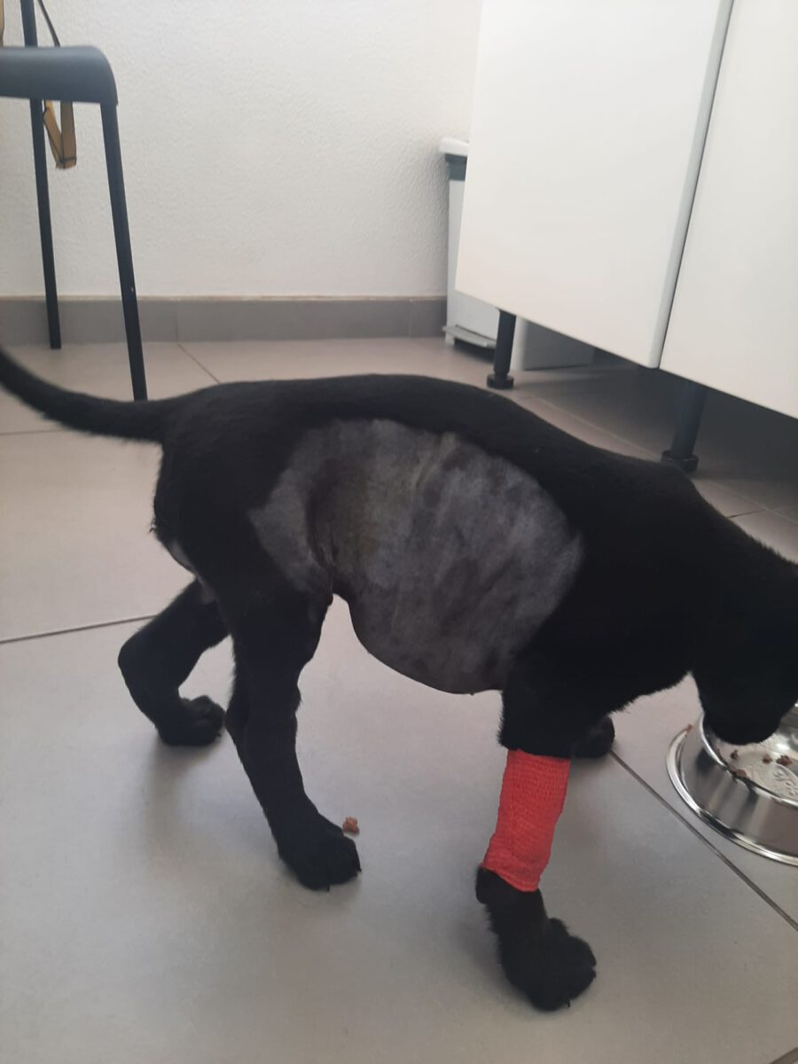 Wieder einmal erhielten wir einen Hilferuf von einer bekannten Tierschützerin, die in der Nähe eines Zigeunercamps einen von einem Auto angefahren Welpen gefunden hatte, der wohl zwei Tage lang am Straßenrand lag! Seine Retterin brachte ihn direkt in eine Tierklinik in Faro, in der er notoperiert werden musste. Seine Organe hatten sich bei dem Unfall verschoben und es entstand ein Bruch in seiner Bauchwand (Hernie). Wenn das nicht schon genug gewesen wäre, sprang bei dem Unfall auch noch sein Hinterbein aus dem Hüftgelenk. Durch die Operation konnten die Tierärzte seine Organe wieder an die richtige Stelle setzen, das ausgekugelte Bein kann jedoch erst eine Woche später operiert werden.