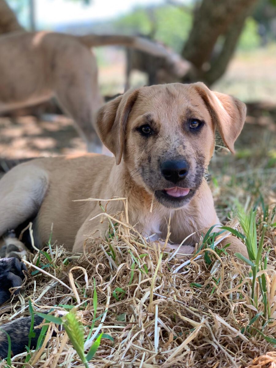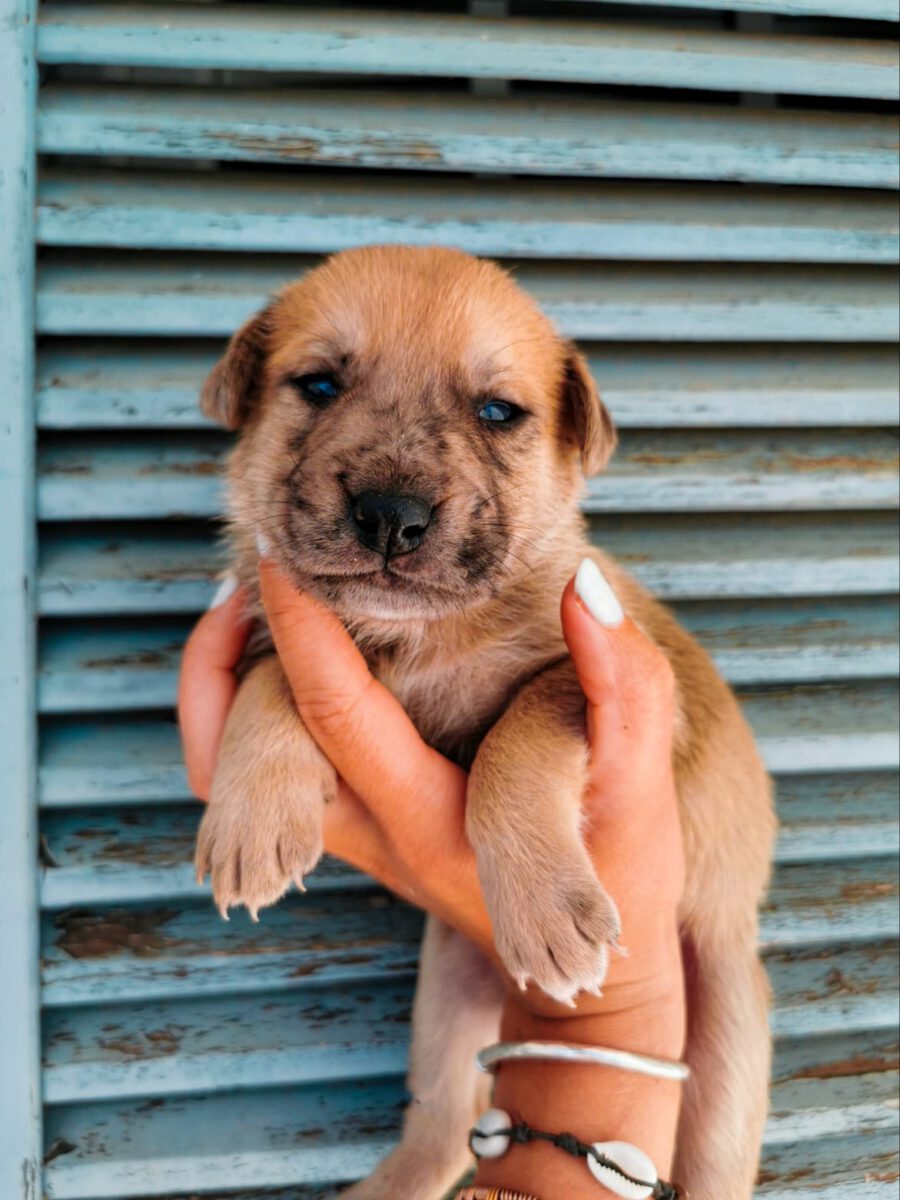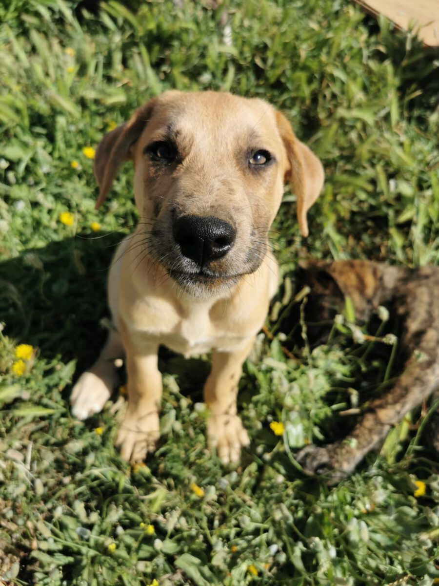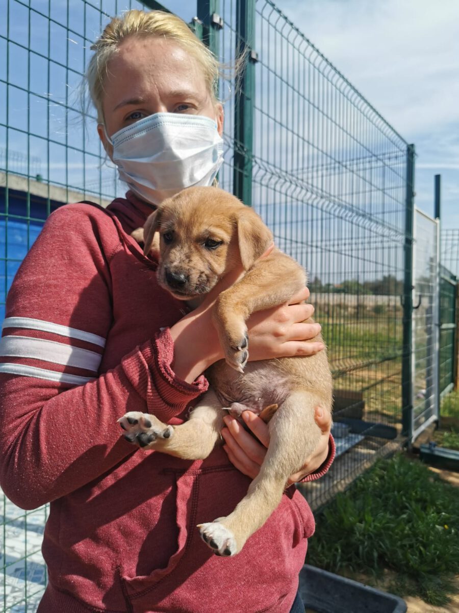 The dog Gala lived together with her mother Amora and her sister Shenzi on the street or near houses. Dear residents fed them, but could not take them in the house. They searched for help for a long time and found none. By a happy coincidence they came into contact with our helper Claudia and so we took the three dogs in with us. Unfortunately we came too late because Gala and her sister were pregnant. On February 26th, 2021 Gala gave birth to 10 healthy puppies. One of them is George.