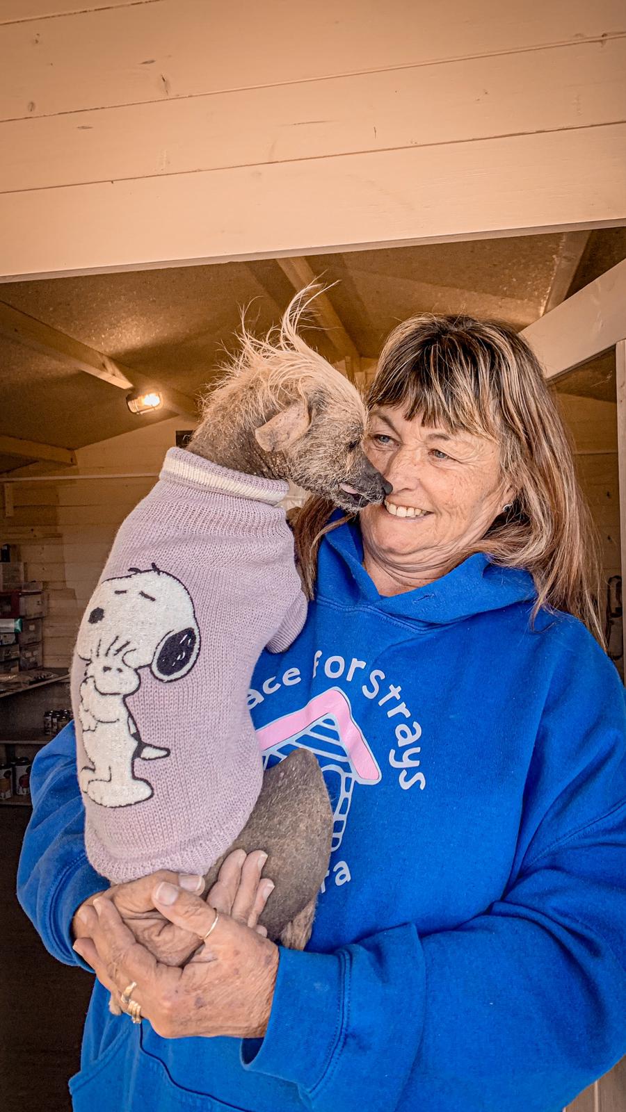Aufgrund ihres fehlenden Fells hat sie mittlerweile sogar eine richtige Garderobe, zu der Oberteile aller Art gehören. Diese werden von unseren Helfern je nach Wetterlage ausgewählt.