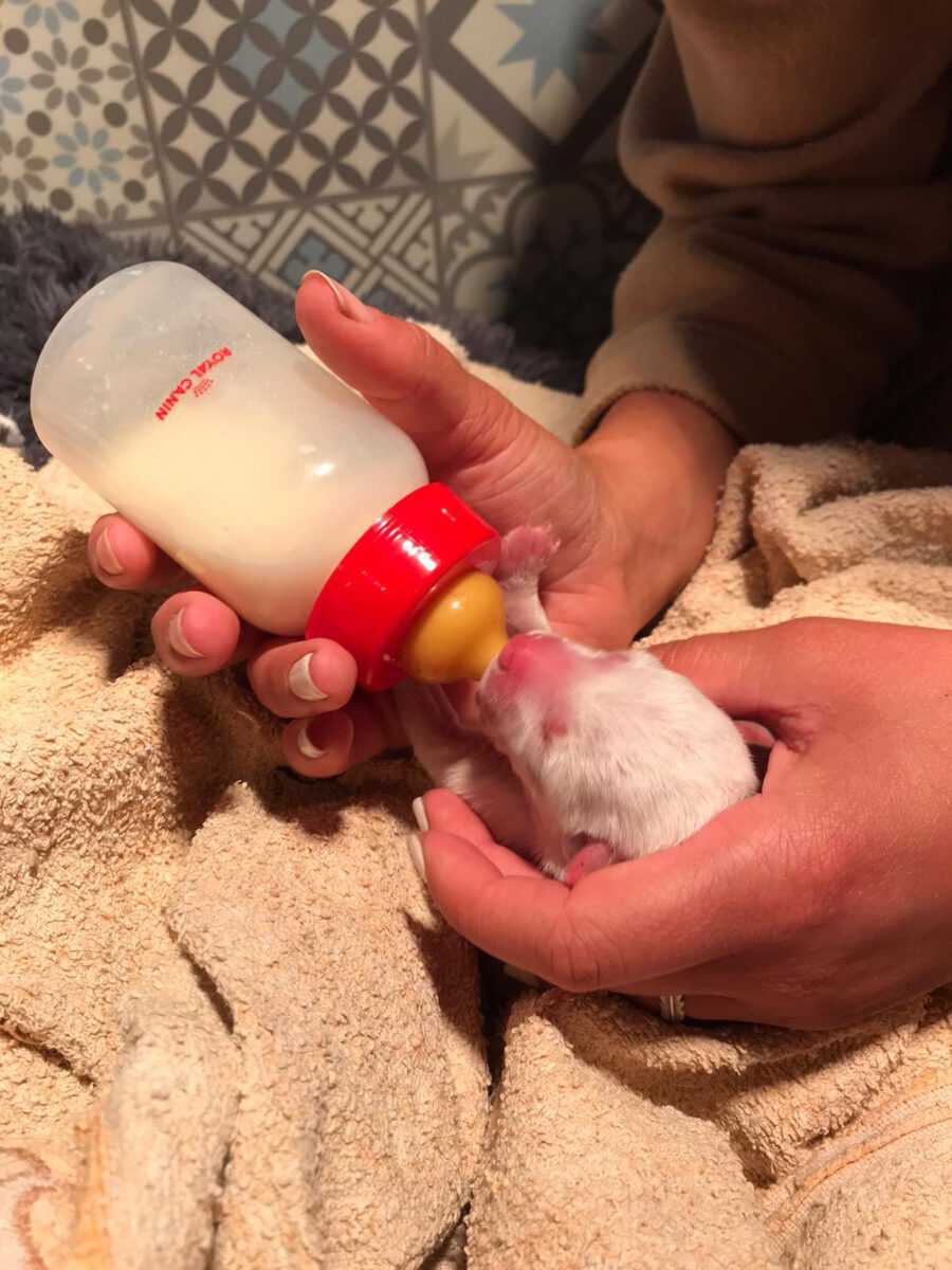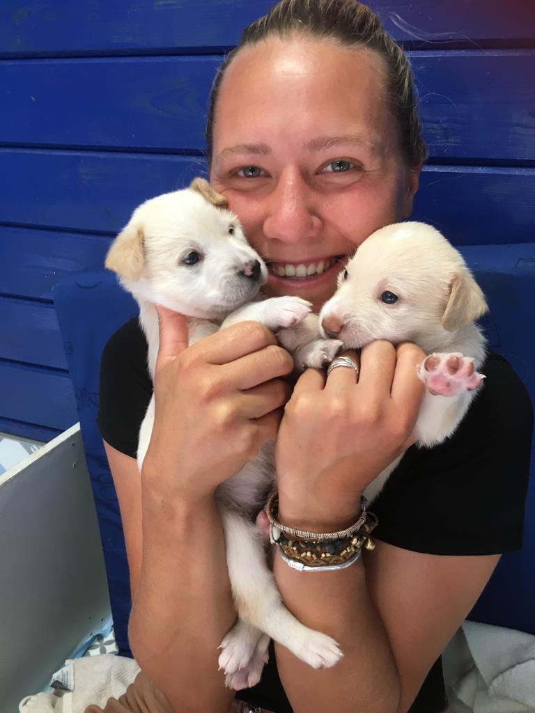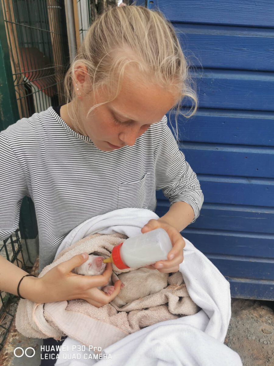 One lunchtime we received sad news: A pregnant bitch from the city shelter had to be euthanized due to complications during the birth of her 7 puppies. The last puppy seemed to be stuck, which led to a fatal infection in the puppy mum. Unfortunately, we don’t know any more. Since the public animal shelter could not find a surrogate mother for the newborns to take in, they were forced to euthanize the puppies. A committed member of the animal welfare organization Pata Ativa did not want to allow this, however, and quickly packed the little ones. However, since she cannot take care of all 7 at the same time, we were asked for help and so it happened that 3 small, newly born puppies were in our care. Our volunteers give everything to nurture the little ones and raise them with bottles. Unfortunately the smallest and weakest of the litter didn’t make it and died. The other two drink hard and put on a bit of weight every day, which gives us hope that they will make it. One of these two puppies is Gretel.