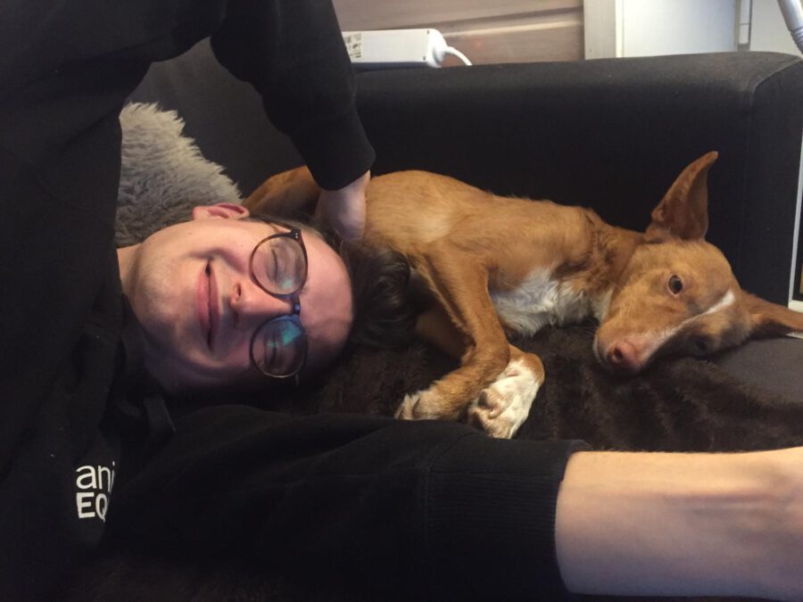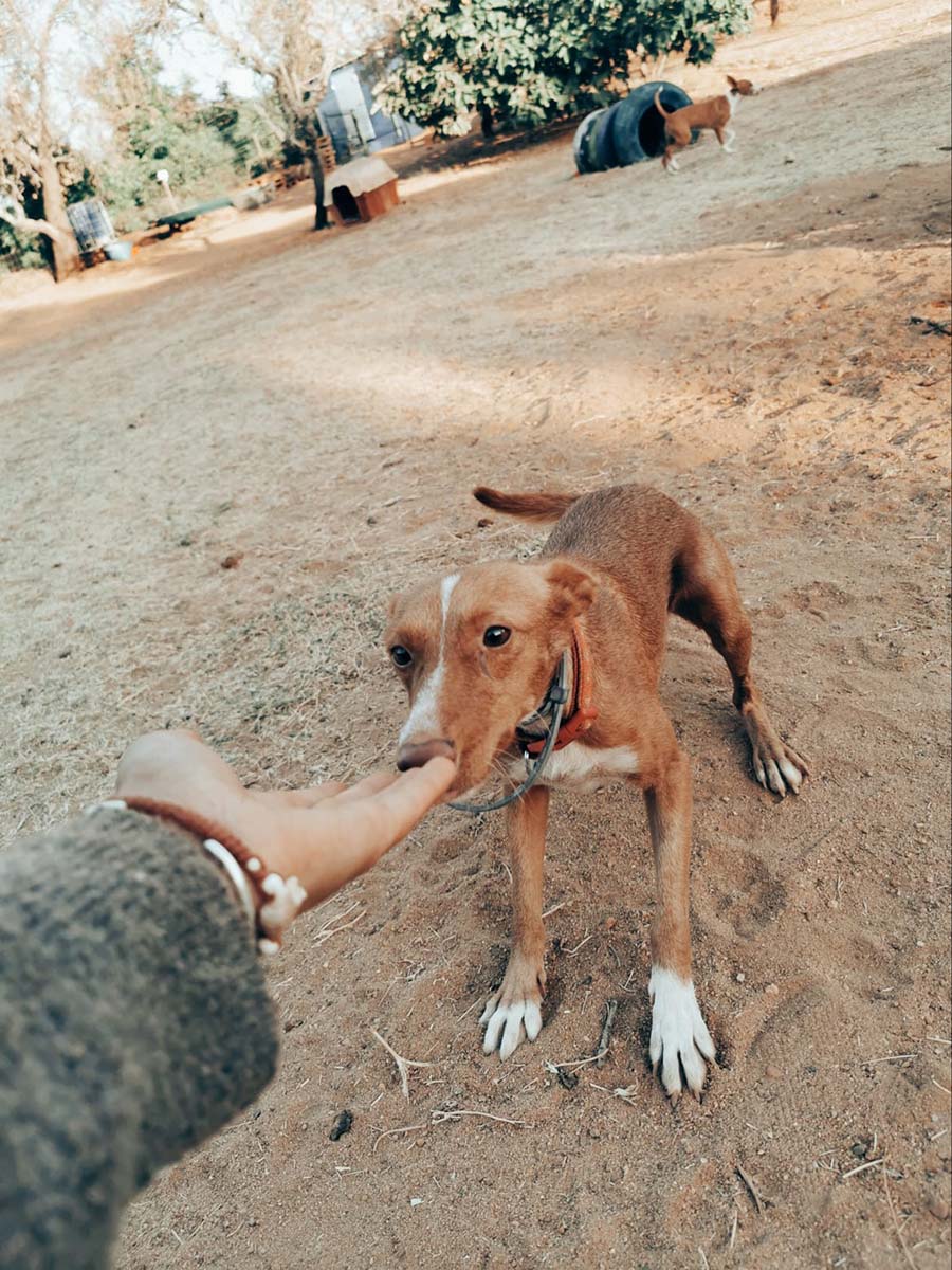Pina was totally frightened when she moved in with us. As long as the puppies were very small, we left PINA in peace to let her raise her puppies. Then, when the little ones got bigger, we started her socialization process. Slowly, in very small steps, our team kept pushing Pina a little further, sometimes forcing her to another little bit of happiness. So after some weeks