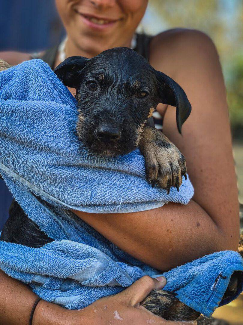 Wieder einmal konnten wir zwei verwaiste Welpen bei uns aufnehmen. Wir wurden auf die beiden durch eine befreundete Tierschützerin aufmerksam, die uns um Unterstützung gebeten hatte. Die beiden waren bereits eine Woche in einer Tierklinik, um vorsorglich gegen den verbreiteten Parvo-Virus behandelt zu werden. Nach der routinemäßigen Quarantäne in der Roten Kreuz-Station zogen sie zu Ginnys Welpen, wo sie liebevoll aufgenommen wurden und sich hervorragend mit den anderen kleinen Fellnasen verstehen. Nun lernen sie kontinuierlich auch die erwachsenen Hunde unseres Rudels kennen.