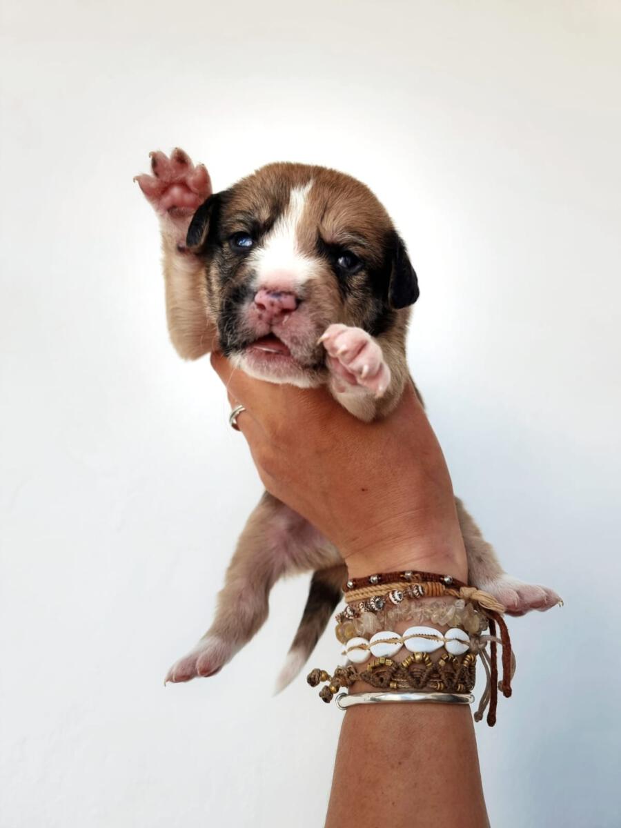 Mit einem restlichen Stück Schnur um den Hals und zahlreichen Wunden wurde die Hündin Priya von einem Mann auf seinem neu gekauften Grundstück zurückgelassen aufgefunden. Leider konnte er sie wegen seines eigenen Hundes nicht behalten und brachte sie deshalb zu Algarvet. Nachdem sie dort ihre ersten Untersuchungen sowie Behandlung ihrer Wunden erhielt, durfte sie ins PLACE for STRAYS einziehen – und das nicht alleine: Der erste Check-Up bei unserem Tierarzt bestätigte dass die Hundedame hochträchtig war! Wir sind sehr froh, dass sie rechtzeitig gefunden wurde und ihre Welpen nicht auf der Straße zur Welt bringen musste, denn diese ließen nicht lang auf sich warten. Kaum im PLACE for STRAYS angekommen brachte die tapfere Mama 9 Welpen zur Welt, von denen es leider nur 7 schafften, einer davon war der süße Reese.
