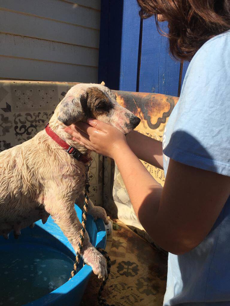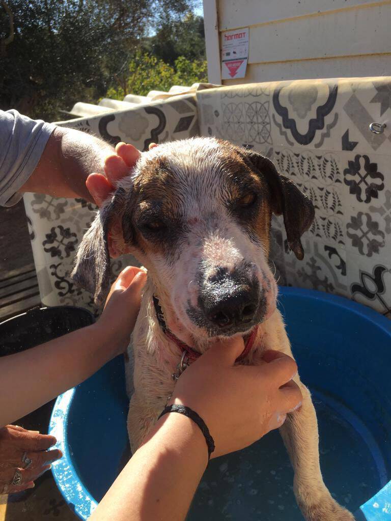 Leider bestätigte der Tierarztbesuch, dass es allen drei Hunden gesundheitlich richtig schlecht ging. Rosa litt an Zeckenbissfieber, Räude und Leishmaniose im Anfangsstadium. Was für ein Glück, dass die drei bei uns gelandet sind! Dank der zahlreichen Unterstützung konnten sie behandelt werden und haben nun wieder ein gesundes und glückliches Hundeleben. Es fehlt nur noch das passende Zuhause.