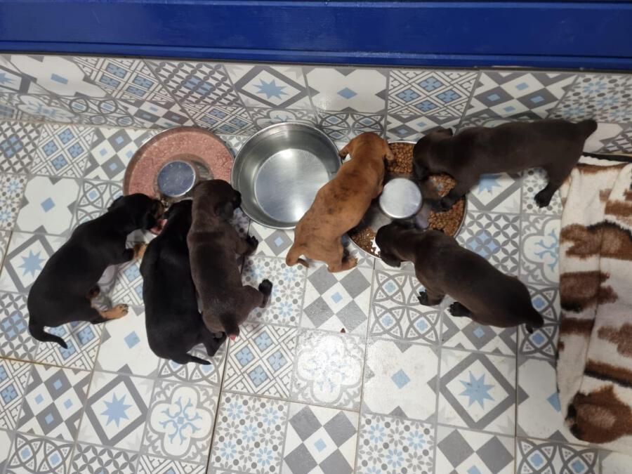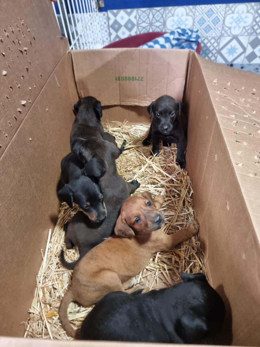 Als die Volunteers eines Morgens zur Schicht an den Shelter gefahren kamen, stand eine Pappbox vor dem Zaun. Den Inhalt der Box könnt ihr euch bestimmt schon denken: Es waren genau 6 kleine Welpen, kaum älter als ein Monat (August 2023). Die Besitzer wussten sich wohl nicht anders zu helfen, und haben sie deshalb mit einem Futtersack davor abgestellt. Bei den Welpen handelt es sich um 4 Mädchen und 2 Jungen. Die 6 Welpen durften natürlich erst einmal bei uns im Shelter einziehen und kamen Quarantänestation. Es schien ihnen glücklicherweise gut zu gehen, weshalb sie auch nach den Impfungen und gesundheitlichen Vorsorge-Untersuchungen mit en anderen Hunden aus dem Shelter zusammengeführt werden konnten. Sie haben sich gut entwickelt und sinn nun zu Junghunden herangewachsen.