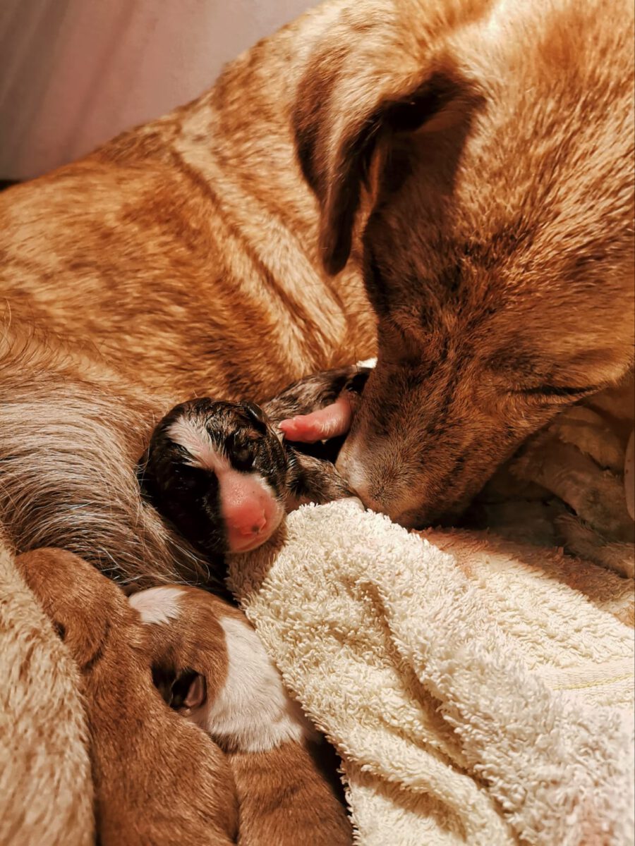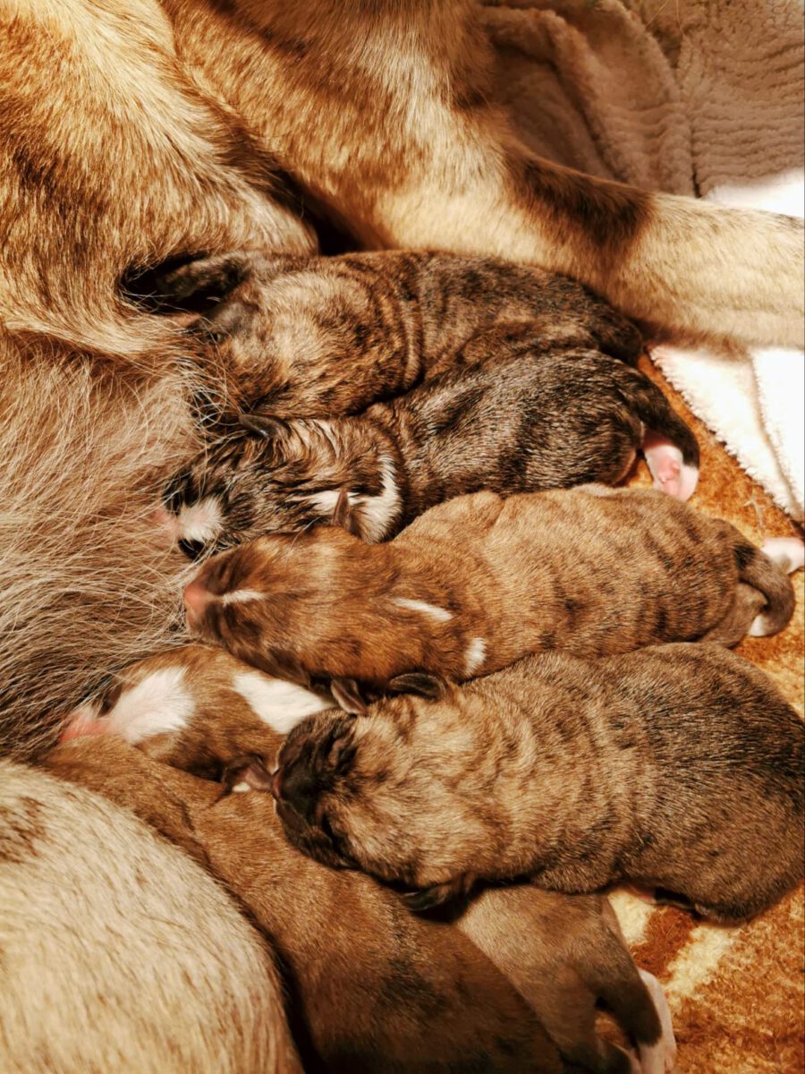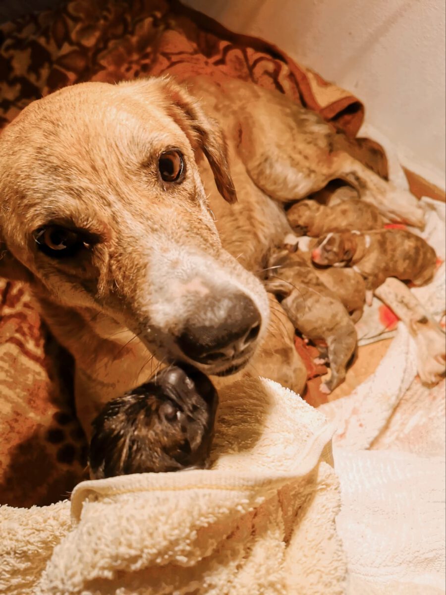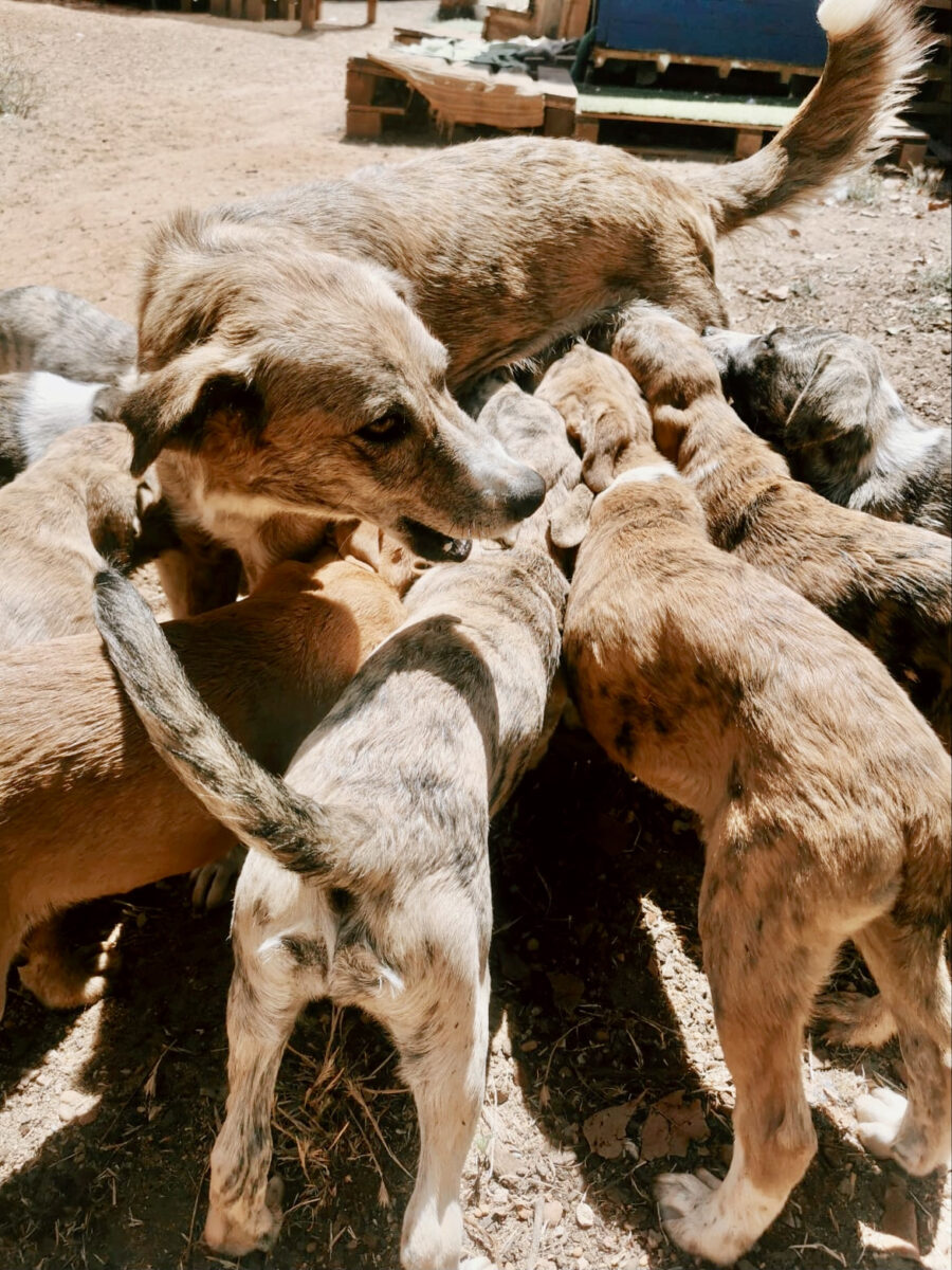 Gala lebte zusammen mit ihrer Mutter Amora und ihrer Schwester Shenzi auf der Straße bzw. in der Nähe von Häusern. Liebe Anwohner fütterten sie, konnten sie aber nicht im Haus aufnehmen. Sie suchten lange nach Hilfe und fanden keine. Durch einen glücklichen Zufall kamen sie mit unserer Helferin Claudia in Kontakt und so nahmen wir die drei Hündinnen bei uns auf. Leider sind wir zu spät gekommen, denn Gala und Shenzi waren bereits trächtig. Aber wenigstens wird dies dann ihr letzter Wurf Welpen sein und den Kleinen wird es von Anfang an gut gehen.