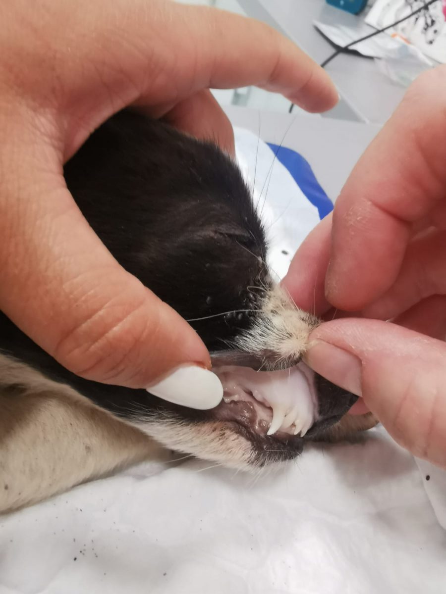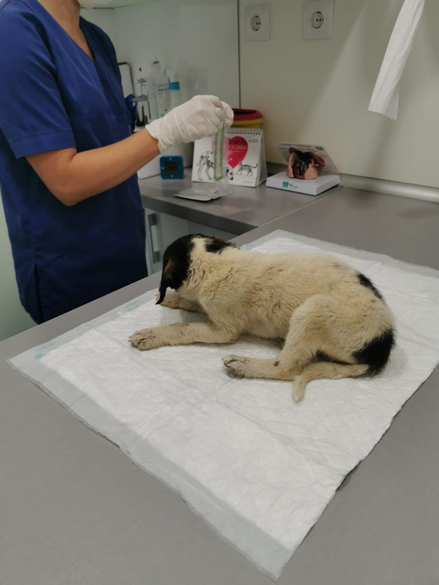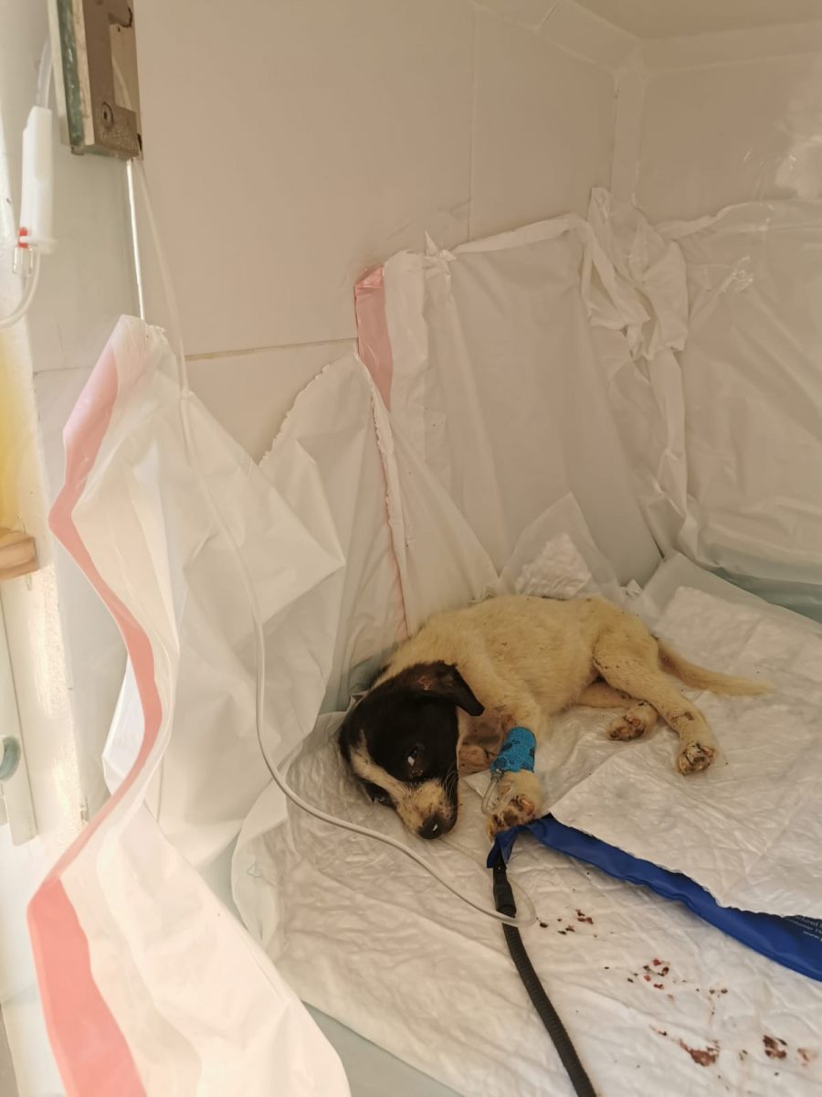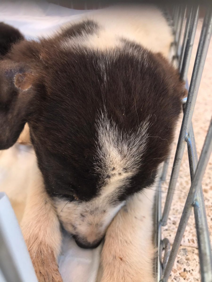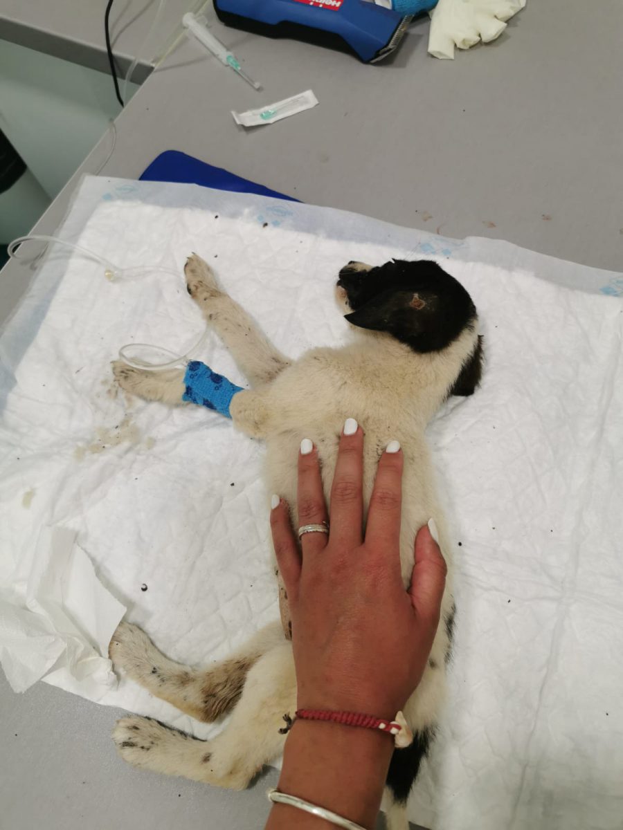 Unsere Helfer waren sofort zur Stelle, versorgten die beiden notdürftig und brachten sie zum Tierarzt, doch schon unterwegs starb eine der beiden Kleinen (auf den Fotos die dunkle). Wir nannten sie MILLIE. Die zweite Kleine schaffte es bis zum Tierarzt, wurde auf ein Wärmekissen und an den Tropf gelegt und wir hofften und beteten einmal mehr, dass sie es über die Nacht und noch viel weiter schaffen würde. Unsere Facebook-Hilfsgruppe nahm großen Anteil am Schicksal der kleinen Happy – dieser Name sollte ihr Kraft und Glück bringen.