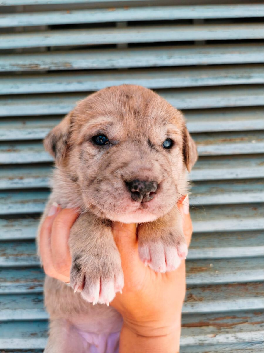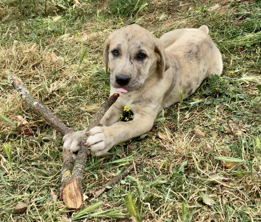 Die Hündin Shenzi lebte zusammen mit ihrer Mutter Amora und ihrer Schwester Gala auf der Straße bzw. in der Nähe von Häusern. Liebe Anwohner fütterten sie, konnten sie aber nicht im Haus aufnehmen. Sie suchten lange nach Hilfe und fanden keine. Durch einen glücklichen Zufall kamen sie mit unserer Helferin Claudia in Kontakt und so nahmen wir die drei Hündinnen bei uns auf. Leider sind wir zu spät gekommen, denn Shenzi und ihre Schwester waren trächtig. Am 17.02.2021 brachte Shenzi 8 gesunde Welpen zur Welt. Eine davon ist Lilo.