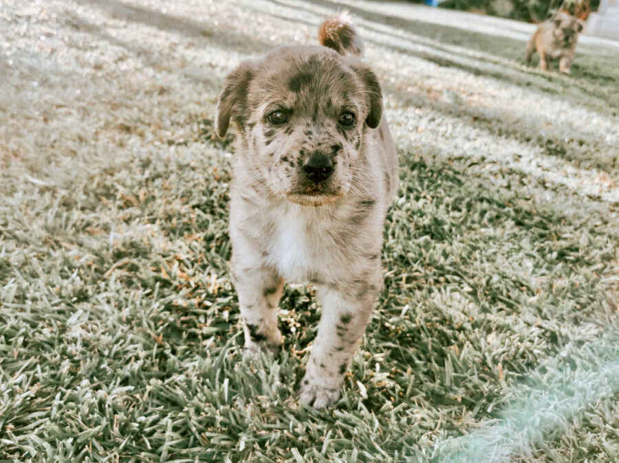 Bei Mogli ist der Name Programm: Ein echter Abenteurer und immer überall vorne mit dabei. Mogli hat im Vergleich zu seinen Geschwistern ein eher spitzeres Gesicht und in seinen Augen funkelt schon immer die Vorfreude auf den nächsten Unfug, den er plant. Er kuschelt auch gerne, aber am liebsten hat er es, wenn sich die Menschen lustige Spiele ausdenken, bei denen er rumhüpfen und bellen kann. Er LIEBT andere Hunde. Besonders unsere Erwachsenen und das will er ihnen auch unbedingt mitteilen. Er will alle abknutschen und wirft sich ihnen vor die Füße. Er ist wirklich immer am lachen und steckt voller Tatendrang. Er läuft auch gut an der Leine und will unbedingt die ganze Welt entdecken.