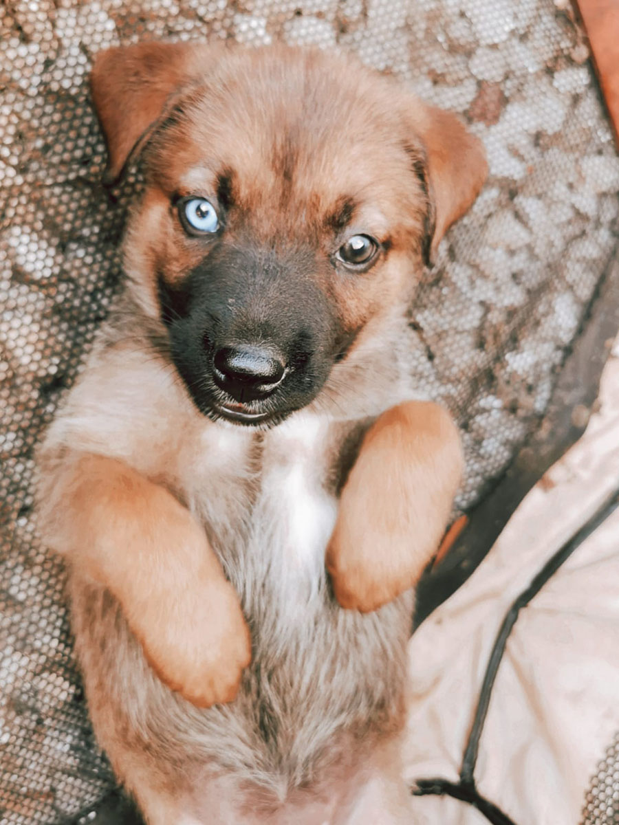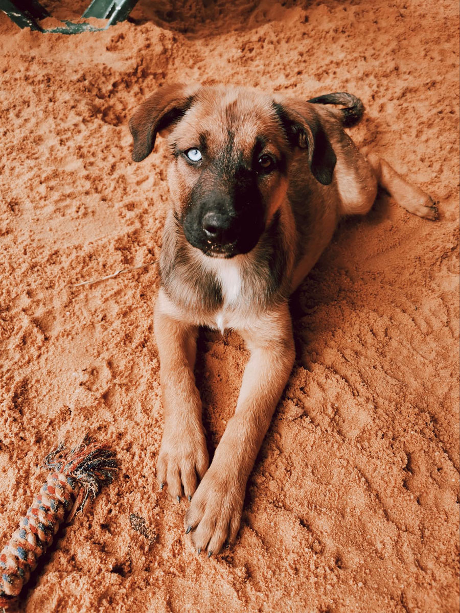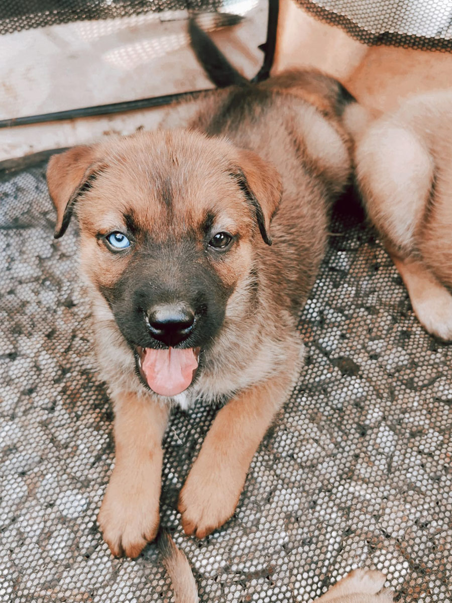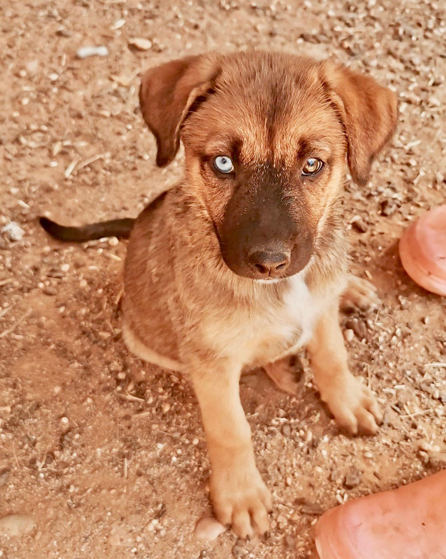 Wir wurden um Hilfe für eine abgemagerte Hündin gebeten, deren Besitzer sich nicht um sie kümmerten und die so aussah, als hätte sie neulich erst Welpen bekommen. Unsere Helfer wollten sich ein Bild von der Situation vor Ort machen, sehen, ob sie helfen konnten und machten sich auf den Weg. Die Hündin war schnell gefunden, und eine Weile später auch ihre Welpen – in einem verschlossenen, dunklen Schuppen, ohne Wasser, ohne Futter und ohne Zugang zur Mutter. Glücklicherweise gelang es unseren Helfern, mit den Besitzern zu sprechen und sie davon zu überzeugen, die Hunde abzugeben. Und so kamen Mama WENDY und ihre 6 Welpen, darunter auch SUNNY zu uns in den PLACE for STRAYS, wo wir uns um die kleine Familie kümmerten. Die Welpen entwickelten sich prächtig und als sie alt genug waren, wurden sie in ihre eigenen, liebevollen Familien vermittelt. Auch Sunny lebt nun glücklich in ihrer Familie.